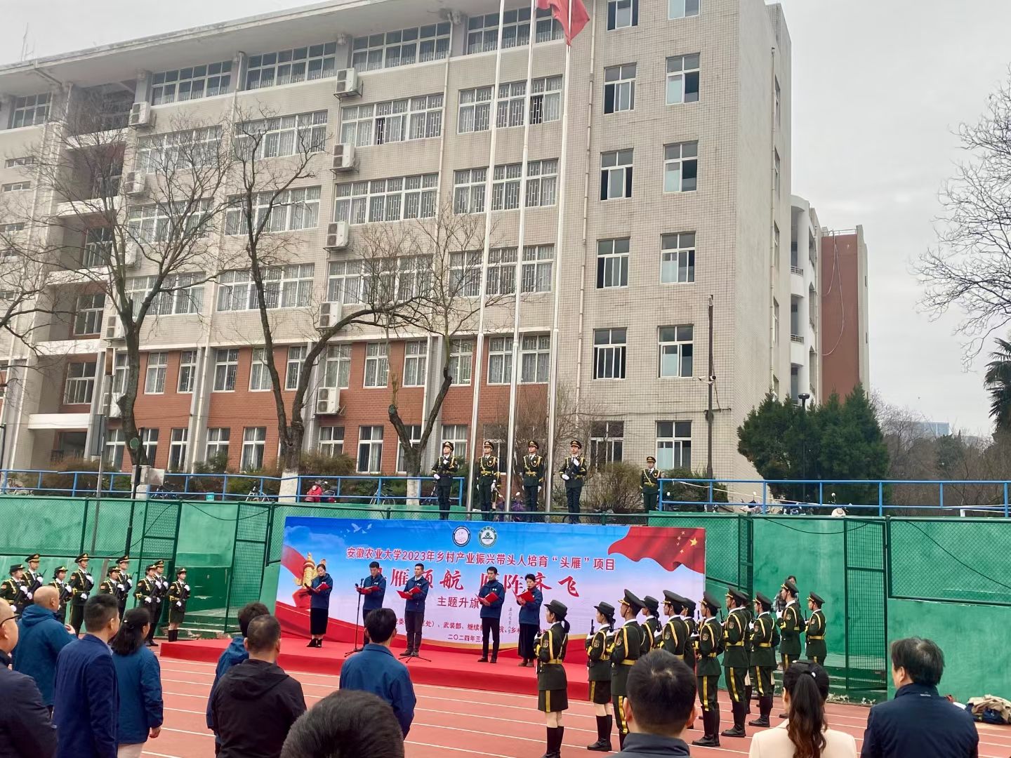本网讯 3月4日,我校2023年乡村产业振兴带头人培育“头雁”学员“头雁领航 雁阵齐飞”主题升旗仪式在第一运动场举行。学生处处长任琪、副处长卢伟,乡村振兴学院党总支书记张晓伟,继续教育学院院长胡启涛、副院长李玮,2023年“头雁”孵化指导团团长、班主任和全体学员参加了仪式。仪式由胡启涛同志主持。
