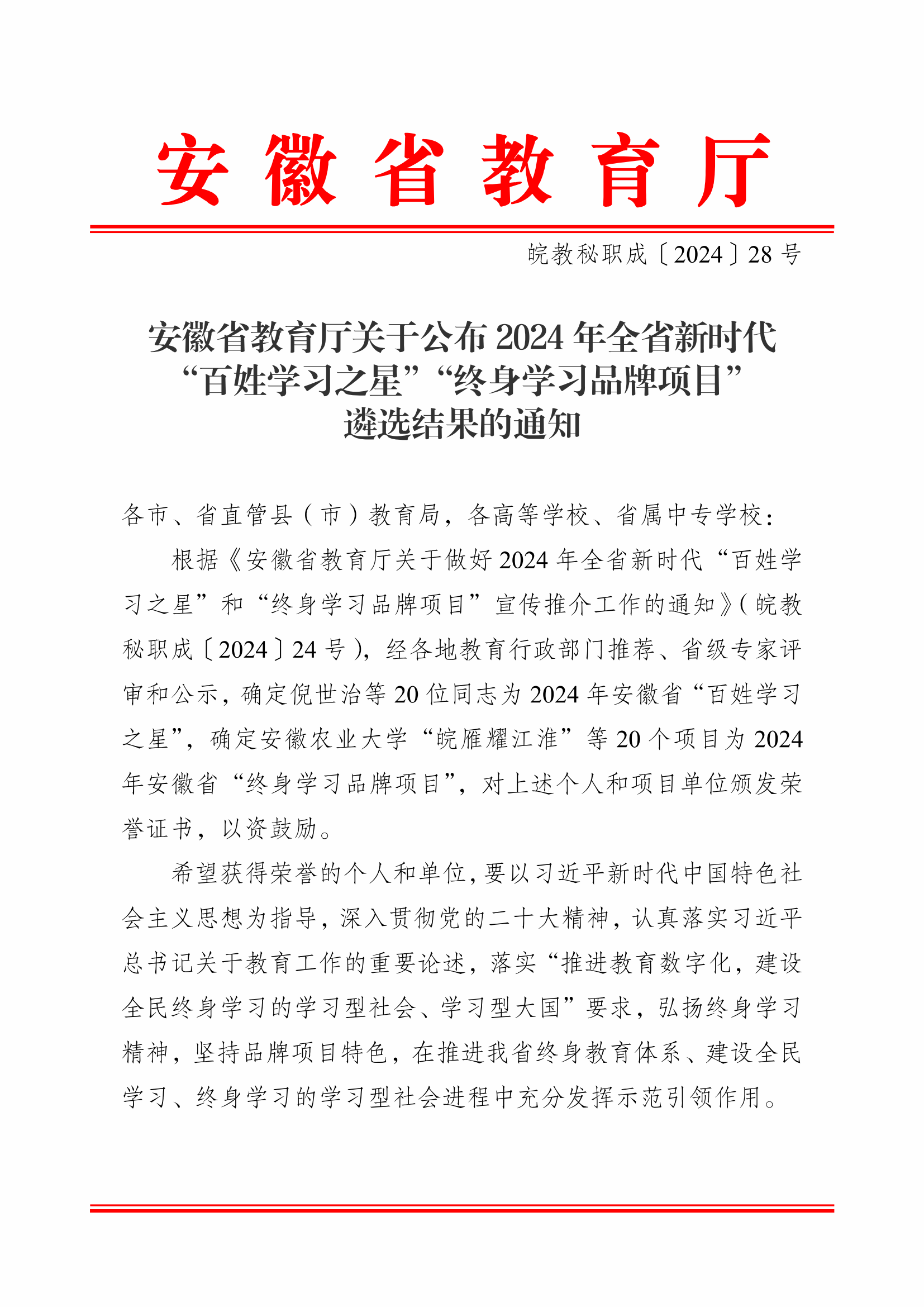 近日,安徽省教育厅下发通知,公布2024年全省新时代“百姓学习之星”“终身学习品牌项目”名单,我校乡村振兴学院、继续教育学院申报的“皖雁耀江淮—乡村产业振兴带头人‘头雁’培育”项目获评2024年全省“终身学习品牌项目”。