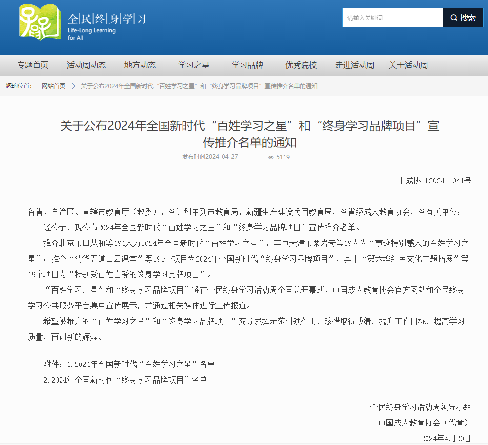 本网讯 4月20日,中国成人教育协会、全民终身学习活动周领导小组下发通知,公布2024年全国新时代“百姓学习之星”和“终身学习品牌项目”宣传推介名单,我校乡村振兴学院、继续教育学院申报的“‘皖雁’耀江淮——乡村产业振兴带头人‘头雁’培育”项目被推介为2024年全国新时代“终身学习品牌项目”。