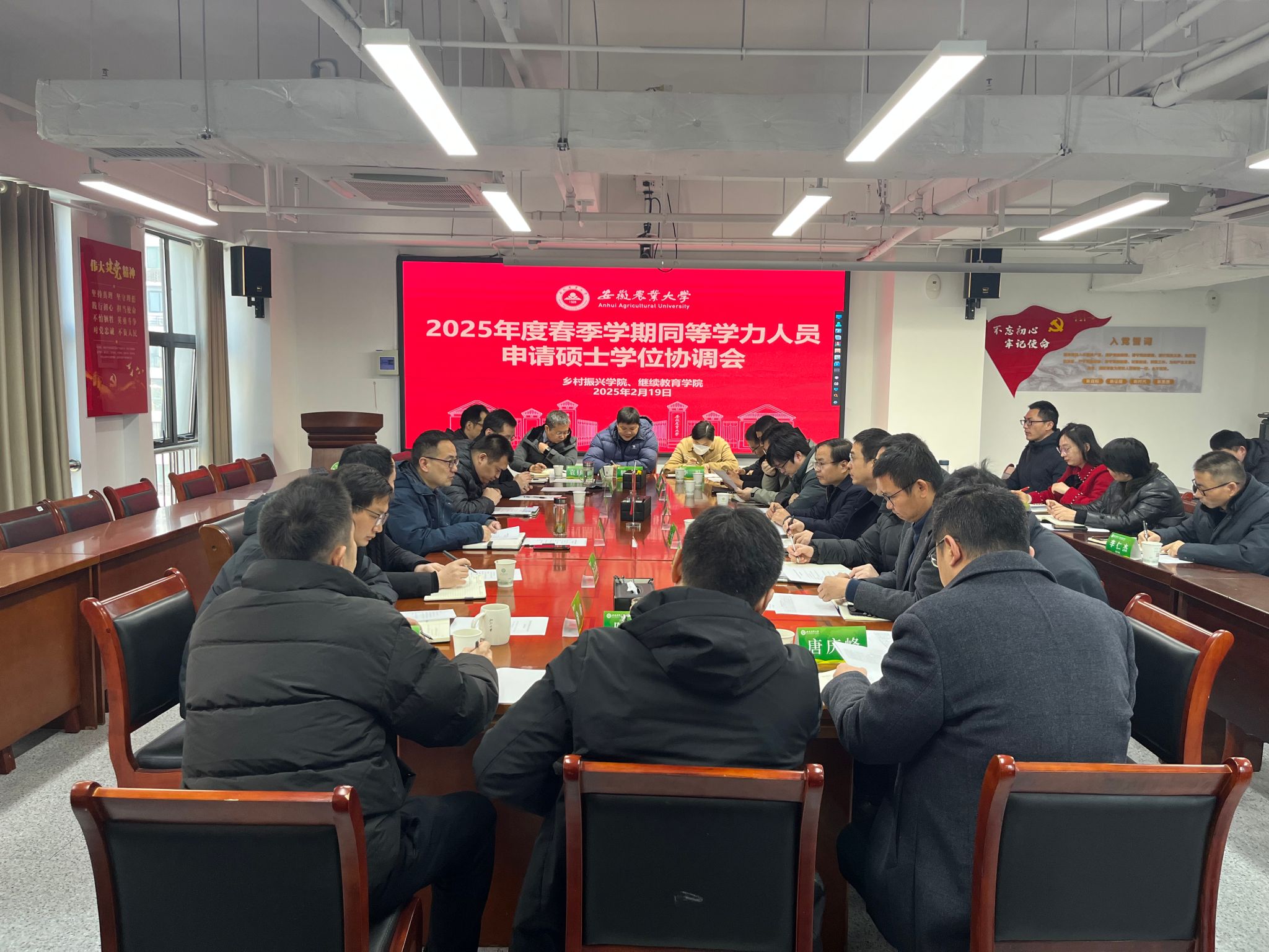 为保障2025年春季安徽农业大学同等学力人员申请硕士学位工作的顺利开展,2月19日上午,乡村振兴学院、继续教育学院和研究生院共同组织召开工作协调会。各学院分管研究生工作负责人参加会议。