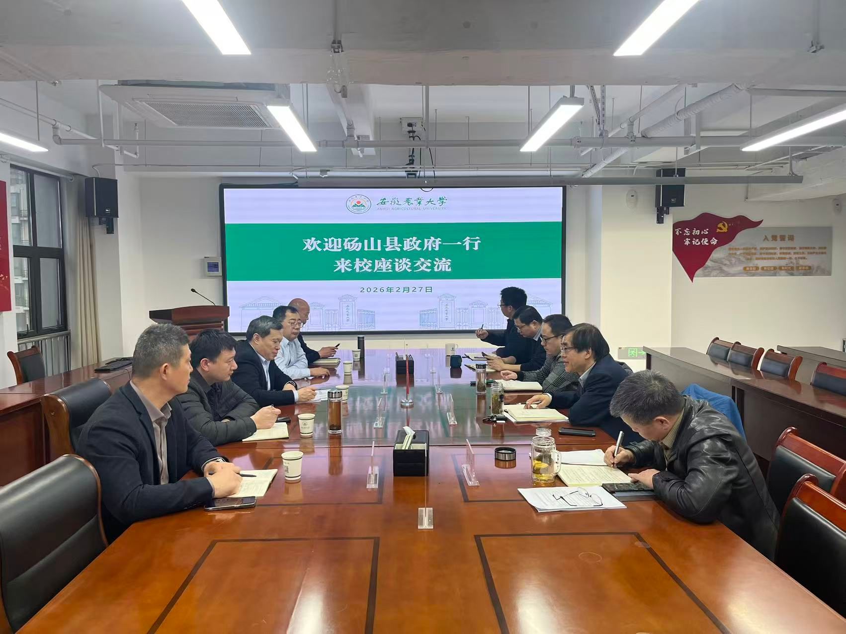 2月27日,砀山县副县长赵振海一行来校调研交流。乡村振兴学院党委书记张晓伟热情接待了刘富成一行,院长刘鹏凌,副院长袁修雨、徐峰参加座谈会。