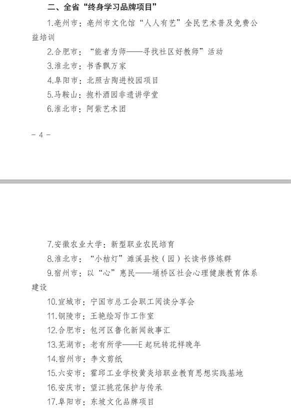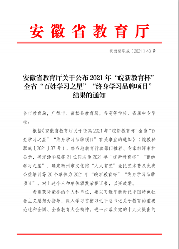 近日,安徽省教育厅下发通知,公布了2021年“皖新教育杯”全省“百姓学习之星”“终身学习品牌项目”名单,我校继续教育学院申报的“新型职业农民培育”项目获评2021年全省“终身学习品牌项目”,这也是我校继续教育工作连续两年获得此项殊荣,充分体现了省教育厅对我校继续教育的肯定和褒奖。
