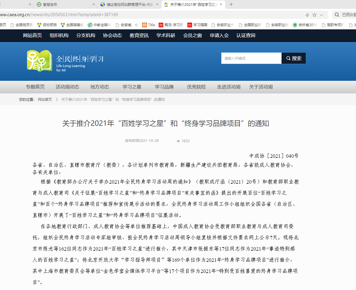 根据《教育部办公厅关于举办2021年全民终身学习活动周的通知》(教职成厅函〔2021〕20号)和教育部职业教育与成人教育司《关于征集“百姓学习之星”和“终身学习品牌项目”有关事宜的函》精神,在安徽省教育厅推荐基础上,中国成人教育协会受教育部职业教育与成人教育司委托,组织全民终身学习活动专家组评审、报全民终身学习活动周领导小组复核,最终我校继续教育学院申报的新型职业农民培育项目获评为2021年国家级“终身学习品牌项目”,并在2021年全民终身学习活动周上进行推介。