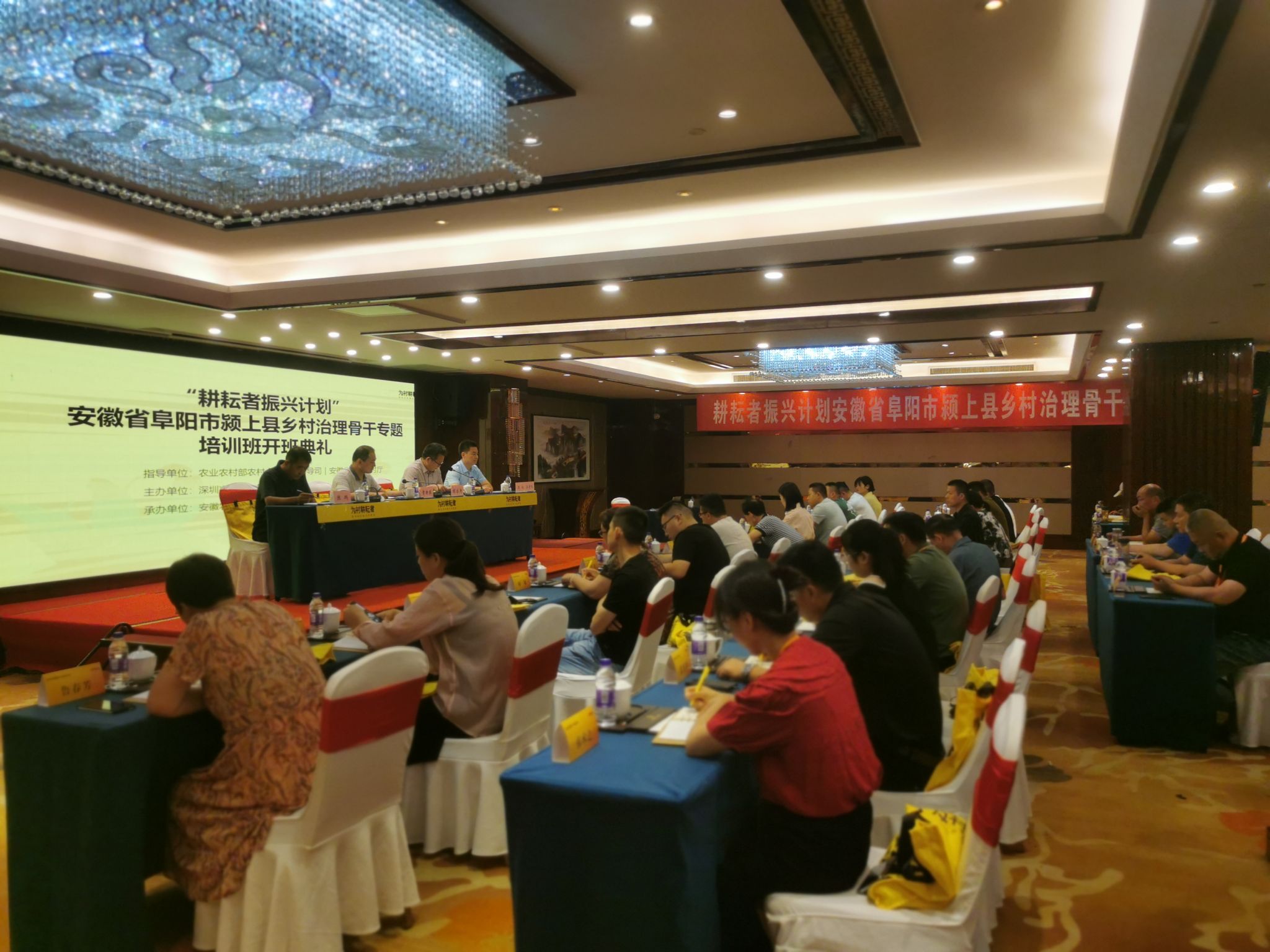 本网讯 6月27日,我校承办的“耕耘者振兴计划”颍上县乡村治理骨干专题培训班在合肥市顺利开班。省农业农村厅农村合作经济指导处副处长章新振、颍上县农业农村局副局长陈鹏、继续教育学院院长胡启涛出席开班仪式。开班式由农业园管理中心主任王成主持。来自颍上县委组织部、宣传部、农业农村局、民政局、乡村振兴局等部门乡村治理工作相关岗位干部、乡镇级干部、村党支部书记、村庄治理骨干共60人参加培训。