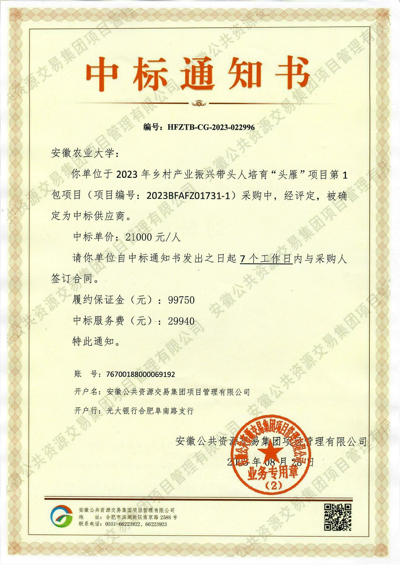 本网讯 近日,安徽省公共资源交易中心发布公告,我校以第一中标单位承担安徽省2023年乡村产业振兴带头人培育“头雁”项目。