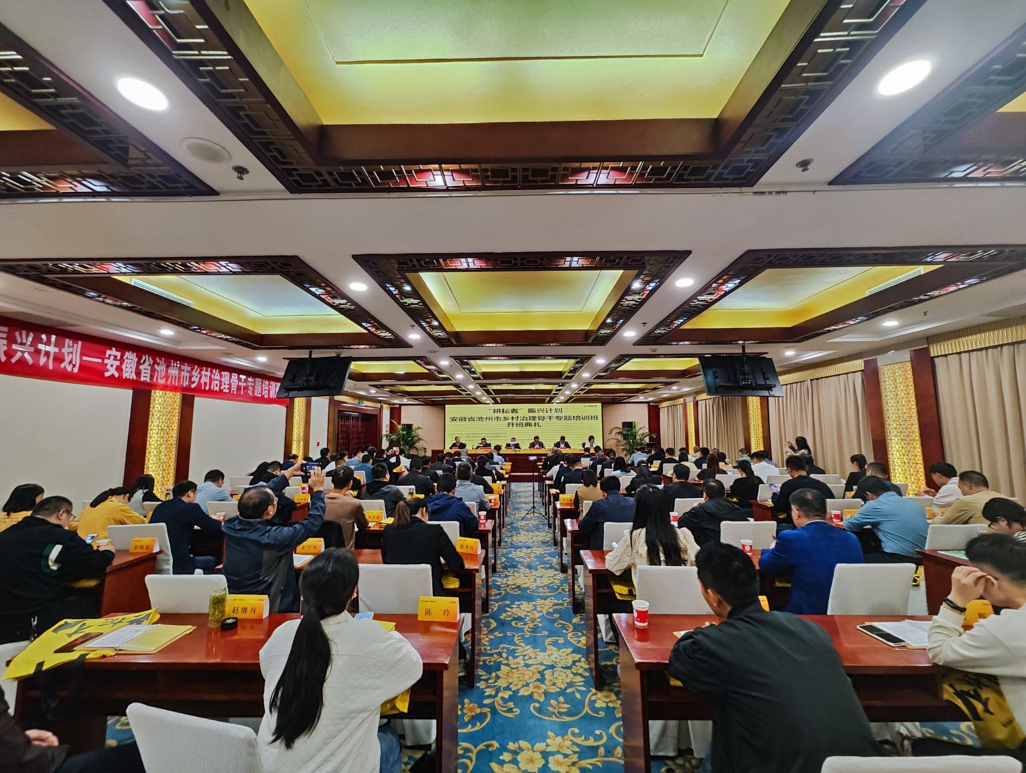 本网讯 10月9日上午,我校承办的“耕耘者振兴计划”池州市乡村治理骨干专题培训班在青阳县顺利开班,省农业农村厅农村合作经济指导处副处长章新振、青阳县政府副县长颜建辉、县农业农村水利局局长王敏、继续教育学院院长胡启涛、轻纺工程与艺术学院党委书记夏成云和副院长周晓娟出席开班仪式,开班仪式由池州市农业农村局党组成员、副局长李志兴主持。来自池州市贵池区、青阳县组织部、宣传部、农业农村局、民政局、司法局等部门乡村治理工作相关岗位干部、村党支部书记和治理骨干共100人参加培训。