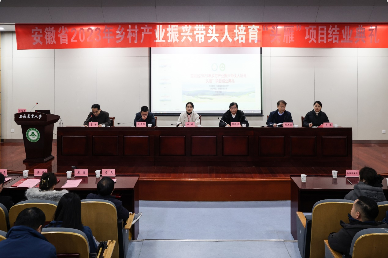 2025年1月10日上午,安徽省2023年乡村产业振兴带头人培育“头雁”项目结业典礼在我校图书馆第二报告厅举行。省农业农村厅人事处一级调研员杨丽出席活动并总结讲话。乡村振兴学院、继续教育学院院长刘鹏凌代表承办单位致辞。典礼仪式由继续教育学院负责人主持。