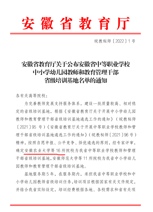 近日,省教育厅公布《安徽省中等职业学校中小学幼儿园教师和教育管理干部省级培训基地名单的通知》,我校获批安徽省中等职业学校教师和管理干部省级培训基地。