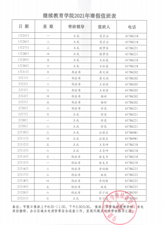 继续教育学院2021年寒假值班表