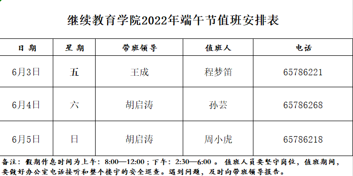 继续教育学院2022年端午节值班安排表