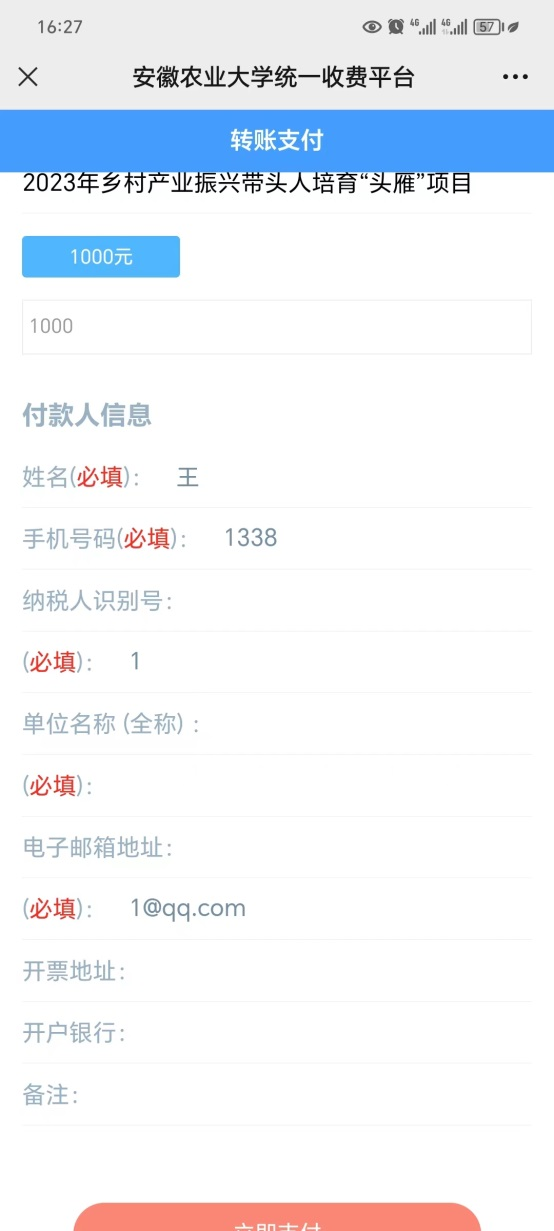 2、登录后进入转账界面,输入金额,填写培训人信息及开票相关信息(发票抬头名称可以选择“个人”或者“企业”,个人开票,纳税人识别号请直接填写身份证号;“企业/单位”名称请正确填写企业/单位全称和纳税人识别号(统一社会信用代码),点击“立即支付”,跳转到订单确认界面,核对信息。点击“提交”,跳转支付界面,选择支付方式(一般选择微信或支付宝后使用绑定的银行卡即可支付),点击“缴费”,按提示完成支付。