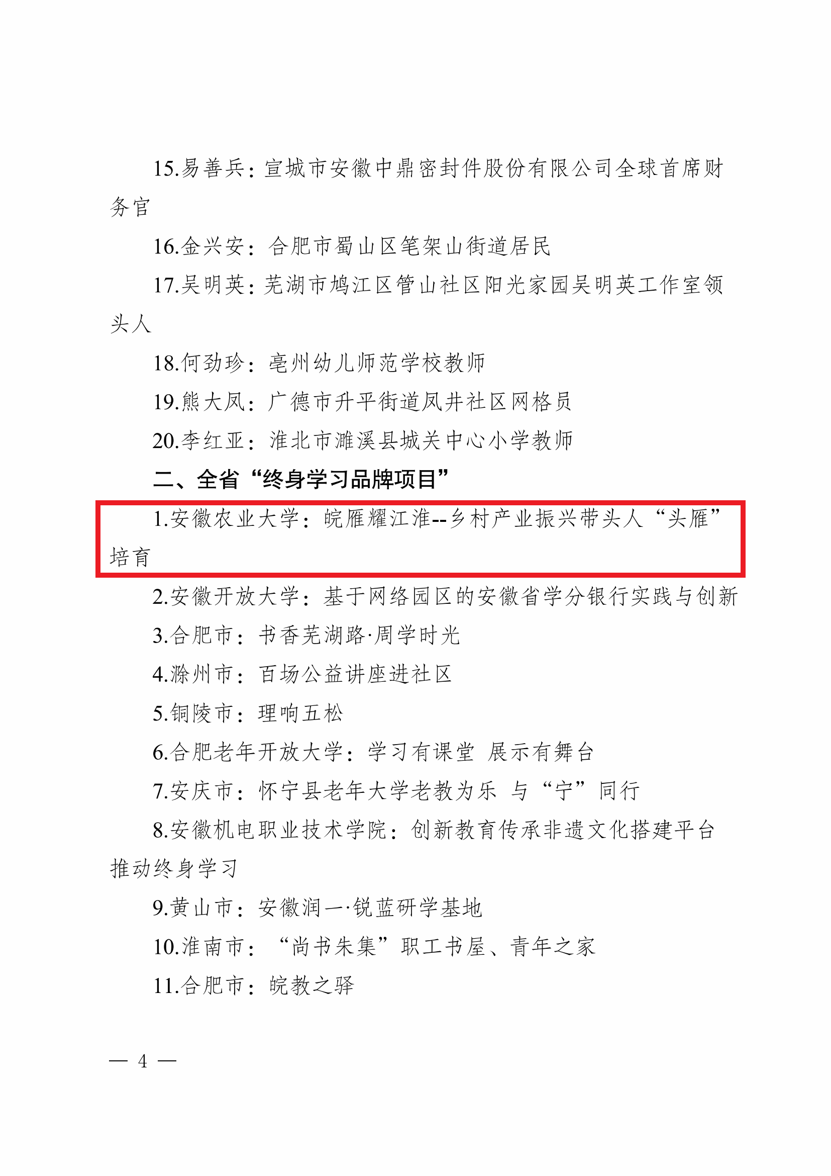 近日,安徽省教育厅下发通知,公布2024年全省新时代“百姓学习之星”“终身学习品牌项目”名单,我校乡村振兴学院、继续教育学院申报的“皖雁耀江淮—乡村产业振兴带头人‘头雁’培育”项目获评2024年全省“终身学习品牌项目”。