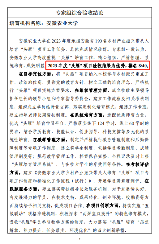 开展“头雁”培育机构考核评价是农业农村部加强头雁培育工作管理,推动“头雁”培育机构动态调整的重要举措。今年3月,农业农村部委托第三方,通过查阅资料、实地考察、线上答辩、学员评价等多种方式,对2023年全国40家“头雁”培育机构进行了综合评价考核。专家组一致认为,我校高度重视“头雁”培育工作,培育目标明确、教学组织规范、组织宣传有力、培育特色明显、学员满意度高。