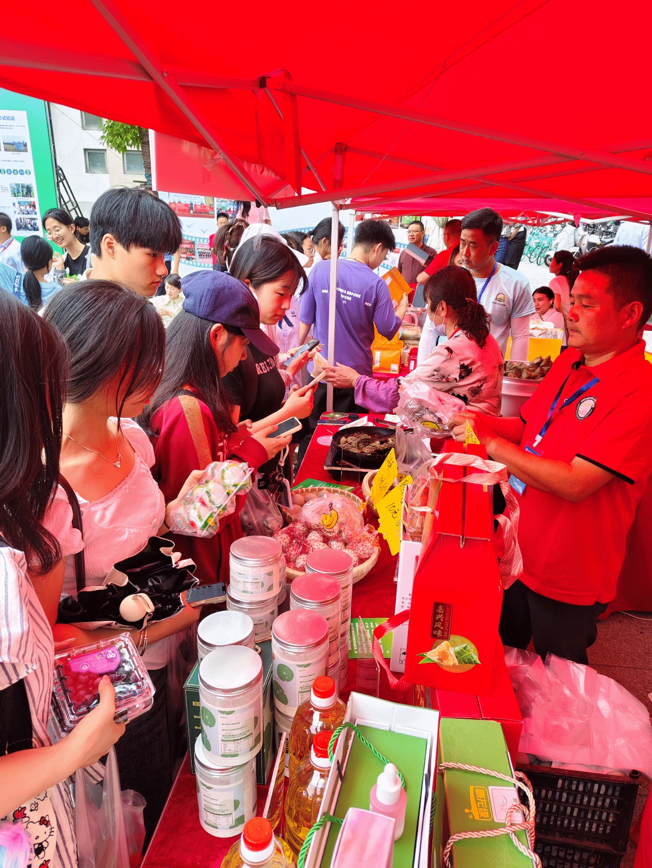 展会从早上7点就掀起高潮,先后吸引了近万名师生现场参观选购,茶叶、山茶油、黄精茶、詹氏山核桃等产品先后爆单,“头雁”联盟首款“头雁头采茶”、藕遇面受到广大师生的热烈欢迎。