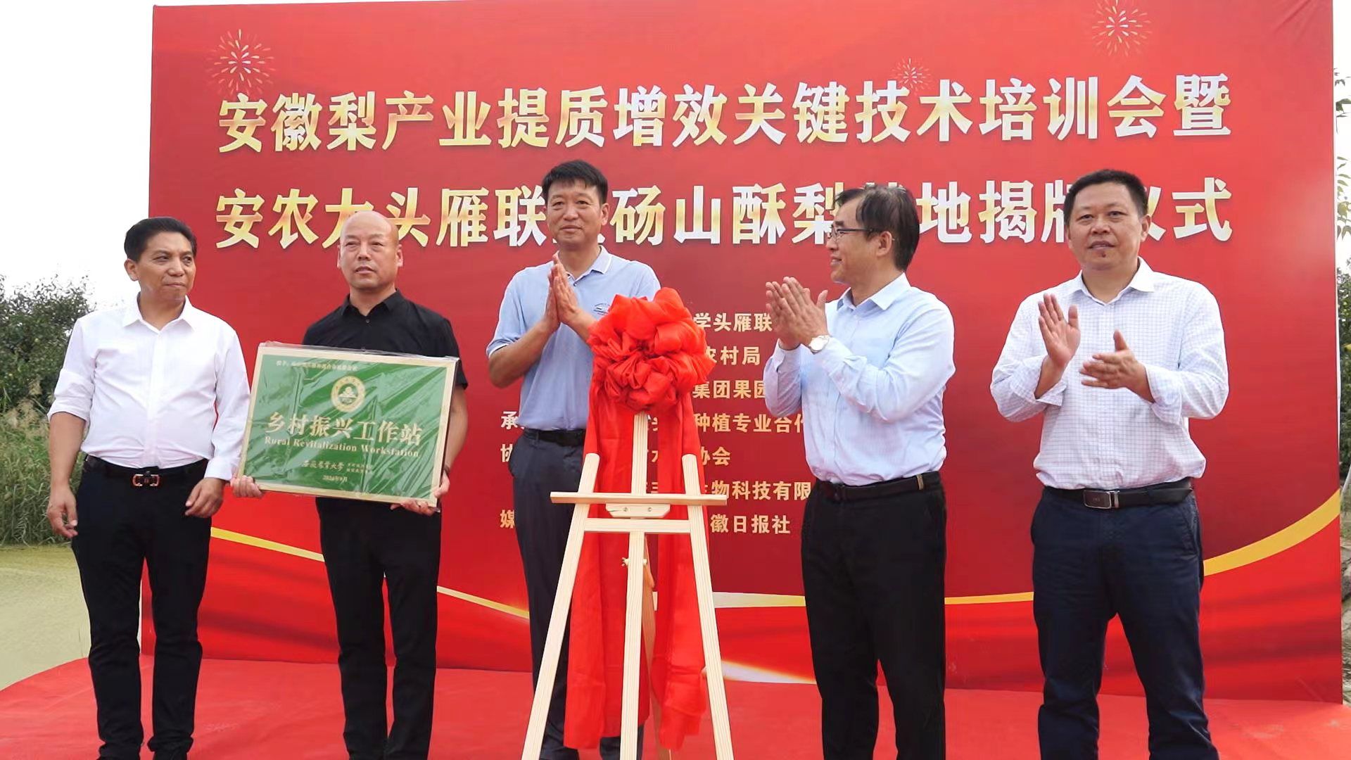 9月26日,安徽梨产业提质增效关键技术培训会暨安徽农业大学“头雁”联盟砀山酥梨基地揭牌仪式在安徽省砀山县举行。会上,安徽农业大学乡村振兴学院、安徽农垦集团砀山果园场有限公司分别与砀山领头雁联合社举行了签约仪式并授予砀山领头雁联合社“乡村振兴工作站”称号。