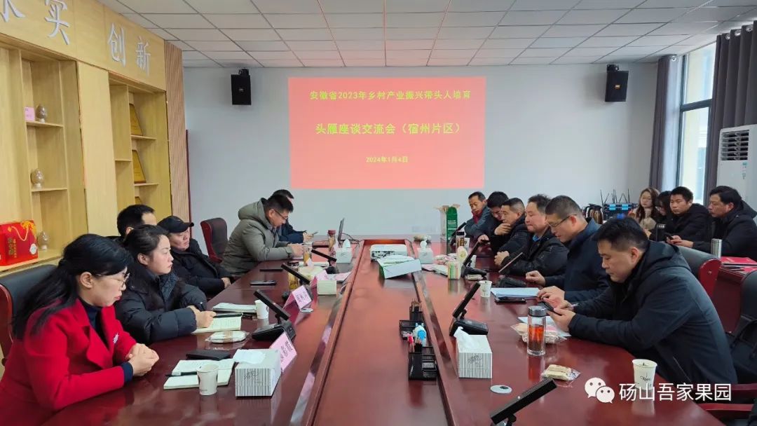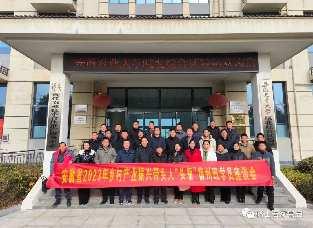 迎风踏雪再相聚,总结谋划上新阶。1月4日,安徽省2023年乡村产业振兴带头人培育“头雁座谈交流会(宿州片区)”活动在安徽农业大学皖北综合实验站举行。来自埇桥、砀山、萧县等市辖各区县,以及阜阳、铜陵等周边市区的30余名乡村产业带头人参加,安徽农业大学、皖北实验站以及宿州市、埇桥区农业农村局等相关领导出席了座谈会。